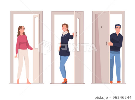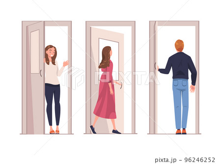 Man and Woman Character at Open Door Leaving and Coming Home Vector Set