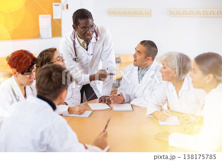 Group of doctors having discussion in classroom of medical university