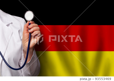 German medical worker's hand with stethoscope on flag of Germany background