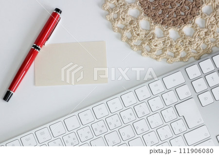 PCキーボードと赤いペンとメモと丸いドイリー ナチュラルなイメージ