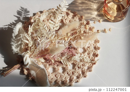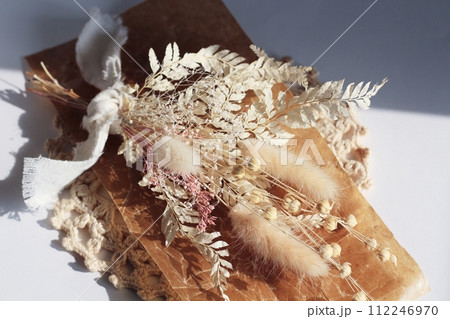茶色の蝋引き紙の上に置かれた白を基調としたドライフラワーと茶色の小さな花瓶
