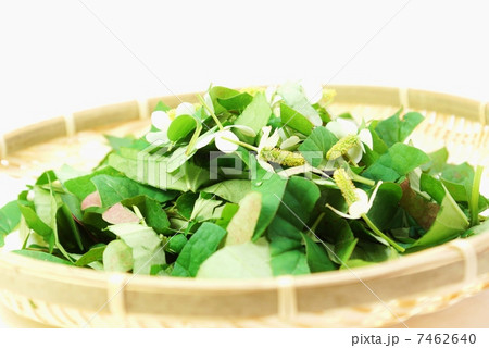 健康茶素材・笊に花の時期のドクダミ・カットなし白バック水平横位置アップ