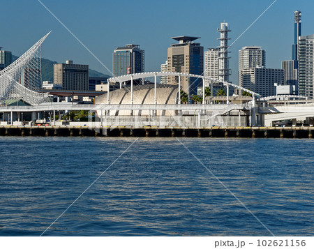 神戸モザイクから見る高層ビル群と神戸海洋博物館・カワサキワールド