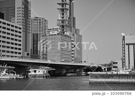メリケンパークから見る神戸市街地の高層ビル (モノクローム)