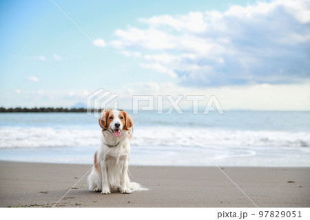 波打ち際でおすわりをして飼い主の指示を待つコーイケルホンディエ