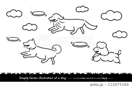 ドッグランで舌を出しながら走る・遊ぶ・飛び跳ねる犬のイラスト素材_モノトーン手書き線画