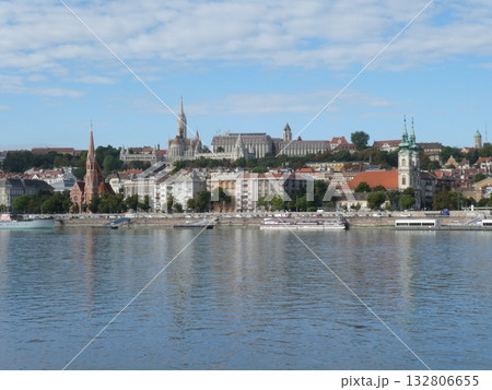 ハンガリー、ブダベストのドナウ川クルーズ船から見たブダ城地区と周辺の街並み