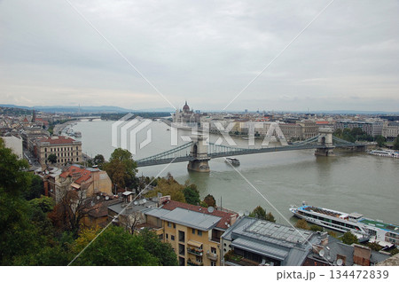 ハンガリー 王宮の丘から眺めるドナウ川・鎖橋・国会議事堂(曇天)