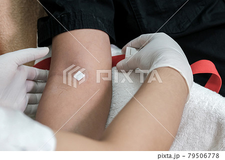 Close up of nurse hand applying adhesive plaster on arm of patient after blood collection in the hospital