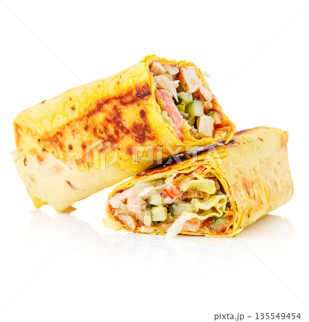 Delicious street food wrap with meat and vegetables on a white background
