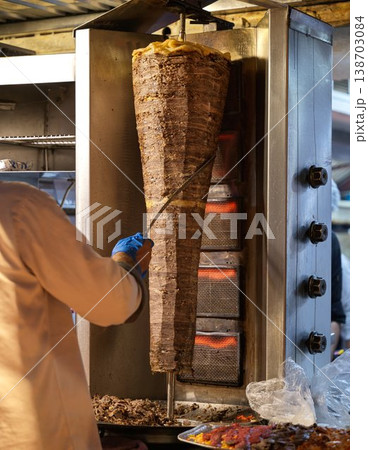 回転グリルで削ぎ落とす牛肉ケバブ(ドネルケバブの調理風景)
