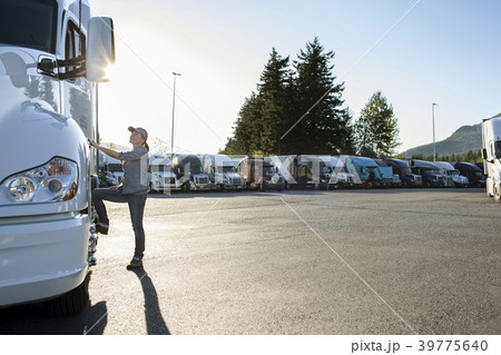 Caucasian female truck driver getting into her truck parked in a lot at a truck stop.