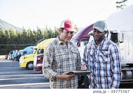 A Caucasian man and a black man truck driving team together in a truck stop parking lot.