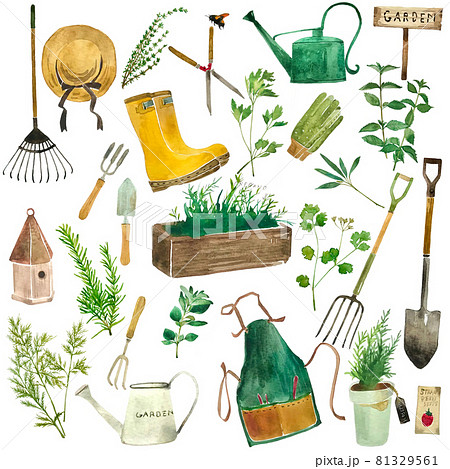 ベクターのいろいろなハーブと植物とおしゃれなガーデニンググッツセットイラスト素材