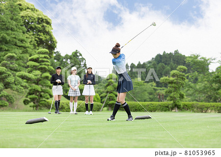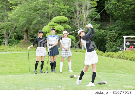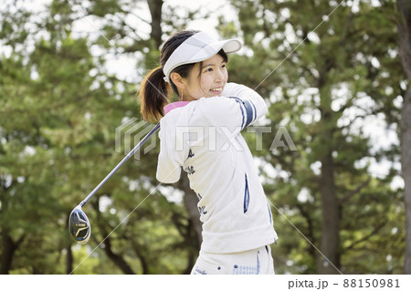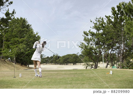 ゴルフを楽しむ女性 ティーショット ドライバー