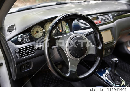 Shift lever, car steering wheel and sensors. Inside a modern car view, city car interior background