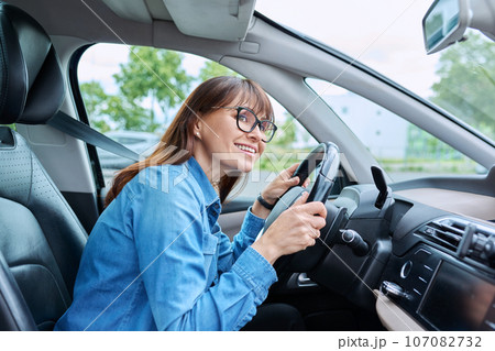 Smiling woman driver in eyeglasses fastens her seat belt before starting car. Driving safety concept