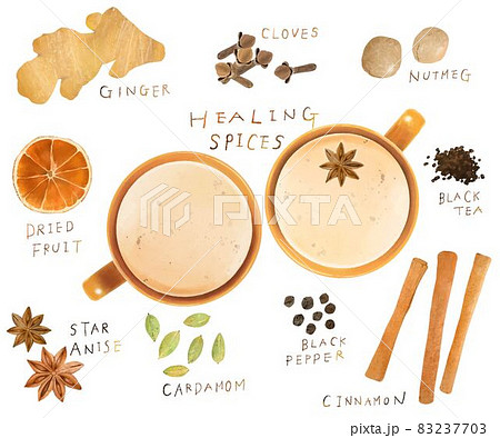 健康美肌薬膳のティー、木の実や生姜、ドライフルーツなどヘルシーなスパイスの種類のイラスト背景素材