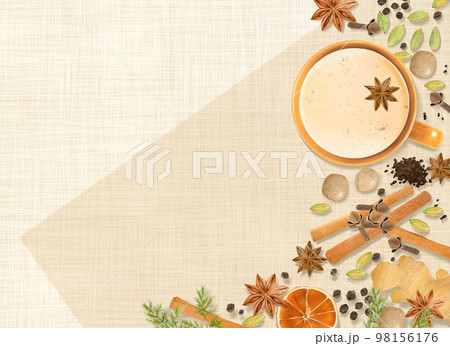 ウッドデッキの上にティーカップ、木の実や生姜、ドライフルーツなどスパイスの種類のイラスト背景素材