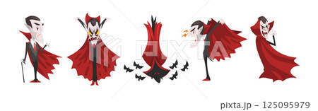 Count Dracula Character with Fangs Wearing Red Cape Vector Set