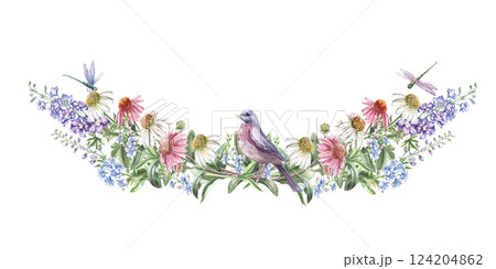 Central composition with a bird and curved flowers. Isolated watercolor illustration of flowers for textile design, printing on fabric and clothes, posters, decor elements.