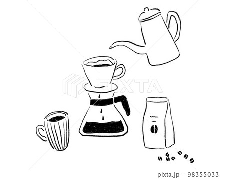 コーヒーのイラスト。コーヒーの淹れ方。シンプルな手描きイラスト。