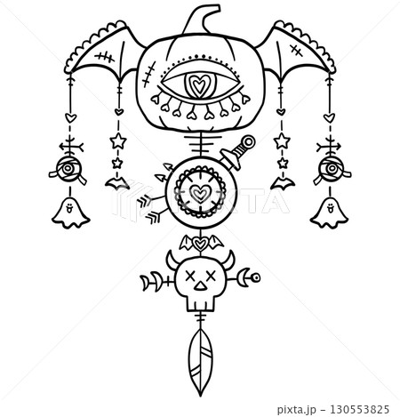 halloween cute cartoon. Abstract black and white mystical totem with symbolic elements and hanging charms. In groovy boho halloweeen doodle line graphic