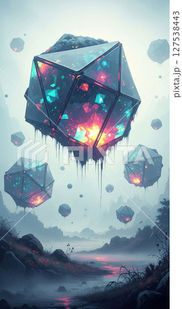 浮遊結晶の夢幻郷:超現実的な霧の中、レアアースが虹色に輝く幾何学的な結晶となり漂う、幻想的な風景。