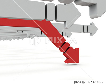 ドロップアウトして降下する矢印。3Dレンダリング。