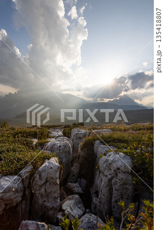Dramatic Mountain Landscape in the Dolomites with Sun Rays and Rocky Foreground