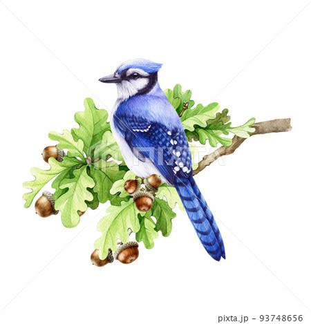 Blue jay bird on the oak tree branch. Watercolor illustration. Hand drawn forest, park, backyards wildlife bird. Blue jay perched on the oak ranch with acorns. White background
