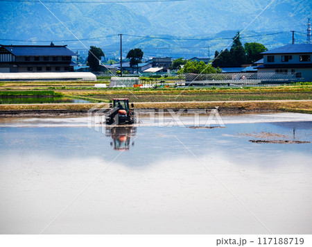 トラクターを使った水田の農作業風景