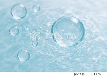透明な青い気泡の背景|清潔感と潤いを感じる美容成分イメージ素材