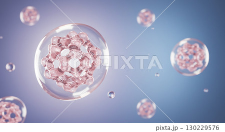 美容成分が浮遊する透明カプセルの3D分子イメージ