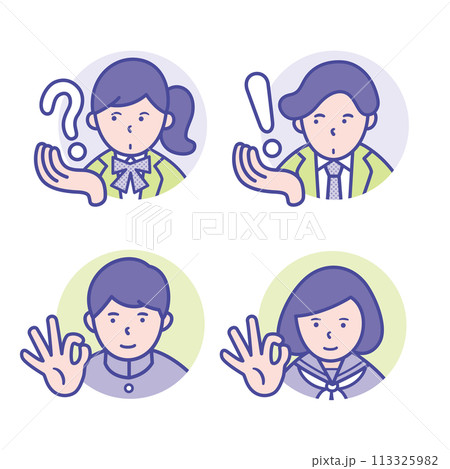 考える、ひらめく、OKポーズをした男女の学生の丸いアイコン【セット】