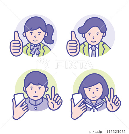 いいねポーズ、スマホを持った男女の学生の丸いアイコン【セット】