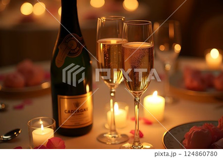 ロマンチックなキャンドルライトディナーとシャンパンの優雅なセッティング24 AI生成画像