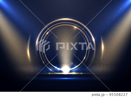 Abstract golden ring circles lighting effect backdrop with spotlight on blue stage background