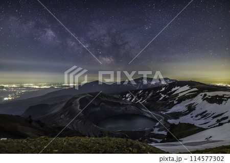(山梨県)竜ヶ岳より望む満天の星と富士山・天の川