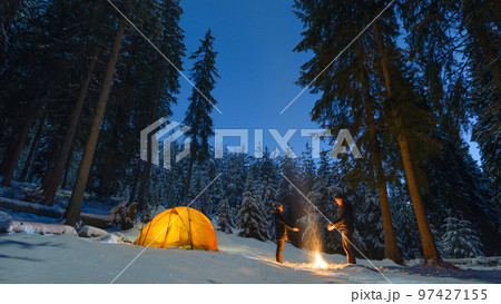 couple sitting near tent camping area night campsite summer camp travel vacation concept