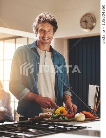 Happy, portrait and man chop vegetables in the kitchen for diet, healthy or nutrition dinner. Smile cooking and mature male person from Canada cutting ingredients for a supper or lunch meal at home.