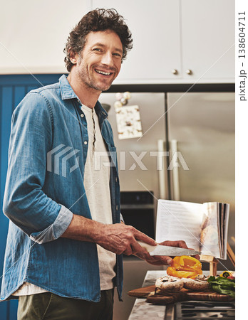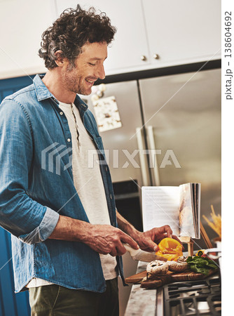 Recipe, food and man cutting vegetables in the kitchen for diet, healthy or nutrition dinner. Book, cooking and mature male person from Canada chop ingredients for a supper or lunch meal at home.