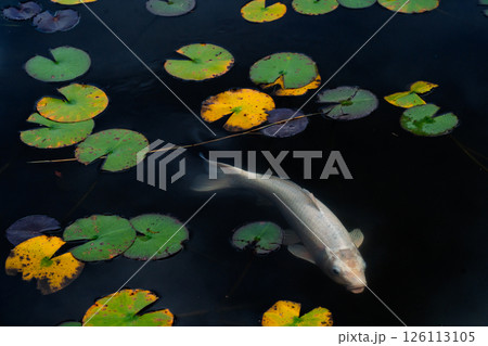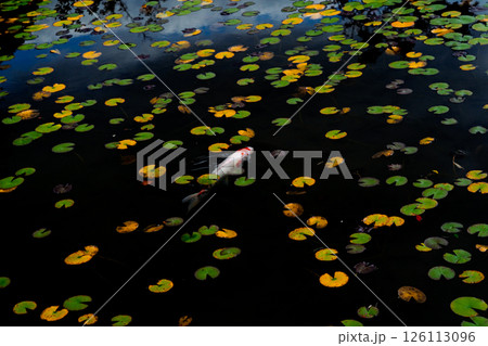 晩秋の色付いた睡蓮の葉と鯉の優雅な姿を撮影