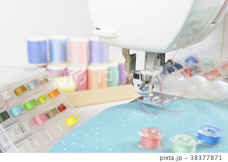 Sewing machine and colorful thread rolls.