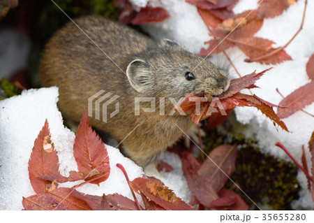 紅葉したナナカマドの葉をくわえたナキウサギ