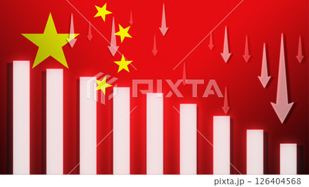 Flag with a declining bar chart and down arrows, symbolizing decline in data, performance, or various national indicators in the country.