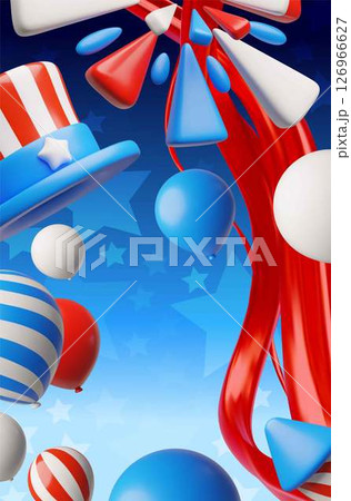 American happy Independence day vector 3D patriotic background design, hat, balloons and fireworks in USA flag colors