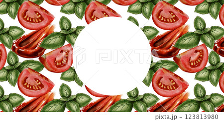 Watercolor frame with tomatoes, basil, and sauce