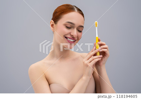 Pretty slim female performing morning dental hygiene routine