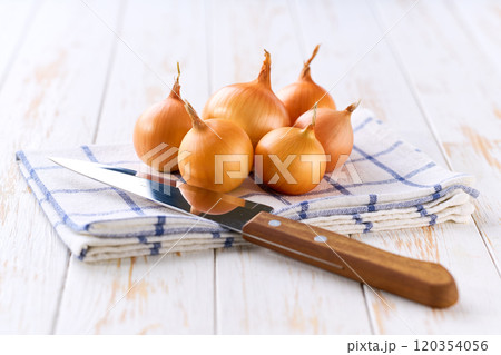 Yellow onions on a wooden table, selective focus. Copy space for text.